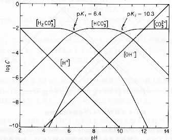 【備考】 ●酸化還元電位 ORP (Oxidation Reduction Potential)酸化還元電位(ORP)とは,水が酸化力をもつ状態か,還元力を持つ状態かを調べる指標で,その単位はmVです。純水のORPは+250mV程度ですので,大まかにいって,+400mV以上だと酸化力を持ち,-0mV以下で還元力が優位といえるでしょう。 酸素は強力な酸化剤ですので,酸素が豊富な,すなわち好気的な環境の水のORPは高くなります。さらに,水道水には消毒のために塩素という酸化剤を添加してありますので,当然自然水よりORPが高くなります。また,有機物(フミン酸やその他の有機酸)にも影響されますので,ORPと水道水の質にはある程度の相関があるでしょう。 逆に,深層地下水など酸素含有量が少ない水ではORPは低くなります。また,富栄養化などによって酸素が消費しつくされた水環境,すなわちヘドロのような水もORPは低くなります。このような還元的,嫌気的な環境では,金属やその他のイオンが溶けだしやすくなり,またアルカリ金属,アルカリ土類金属のイオン(俗にいうミネラル)を含みます。ミネラル分を豊富に含むだけならそんなに問題はありませんが,リンの溶出を招いて富栄養化をさらに促進したり,ヒ素などの有毒なイオンを含んだりする場合もあるので,水源の選定の際には注意しましょう。 【備考】 ●遊離炭酸水中では,CO2として存在する量はごくわずかで,ほとんどが炭酸H2CO3として存在します。よって,水中の炭酸の存在は,下のような対数濃度図で表すことができます。